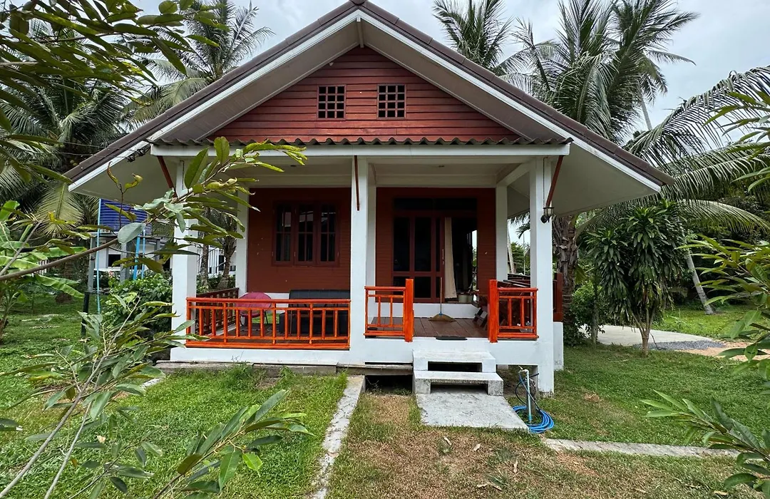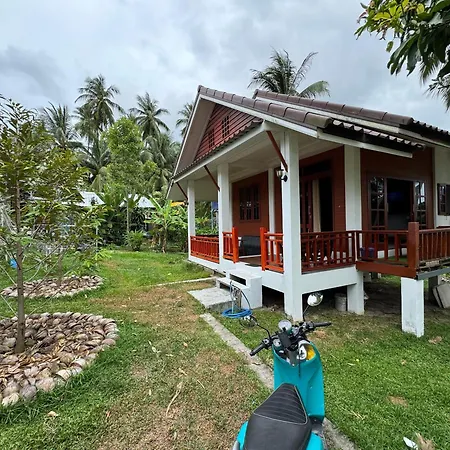 Die 1-Zimmer- Villa Tropical Wooden House Ko Pha Ngan verfügt über ein privater Autoparkplatz und eine Terrasse mit Aussicht auf den Garten.